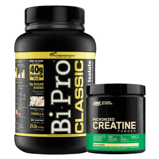 La sinergia entre ambos productos hace de este combo una herramienta poderosa para alcanzar tus metas físicas: mientras Bipro Classic aporta los nutrientes esenciales para la reparación y crecimiento del músculo, la creatina aumenta tu capacidad de esfuerzo y recuperación.