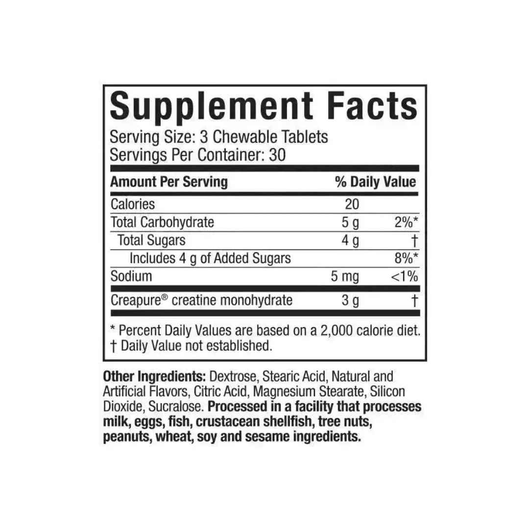 Cada tableta masticable proporciona una dosis efectiva de creatina, un compuesto esencial que el cuerpo utiliza para producir energía durante entrenamientos intensos. Su consumo regular contribuye a mejorar la fuerza, aumentar la masa muscular magra y reducir la fatiga durante la actividad física. Además, gracias a su presentación portátil, puedes llevarlas contigo y usarlas en cualquier momento del día sin complicaciones.